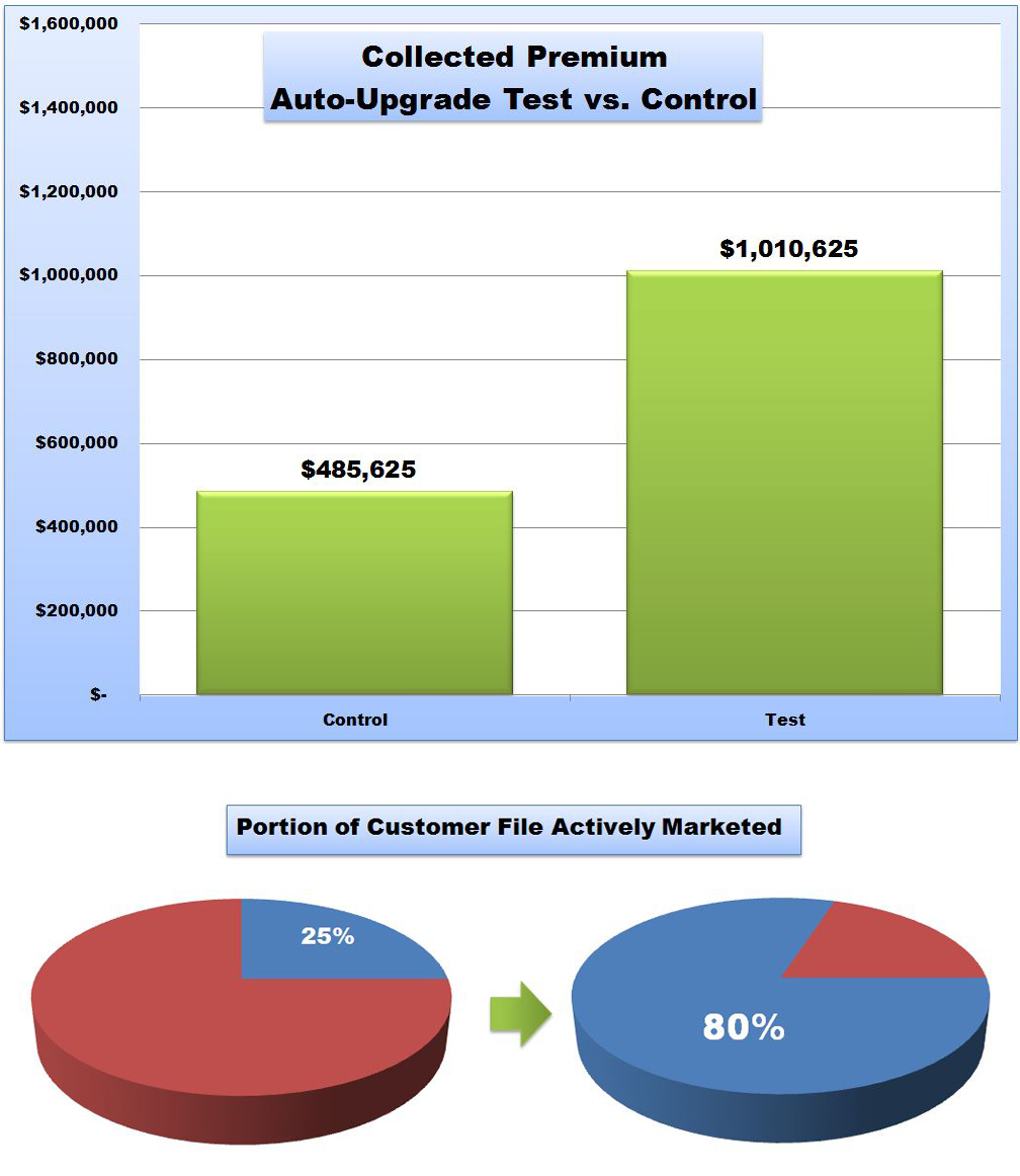 MMI tested several new offers against the bank's control. One of the new offers MMI developed was the automatic upgrade of a complimentary coverage to a higher level of coverage after an introductory period. The automatic upgrade offer generated more than double the amount of premium of the control. MMI then launched a series of new creative tests and new products, which opened up cross-sell opportunities to previous buyers.